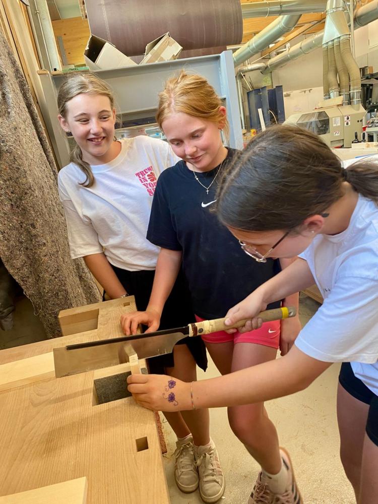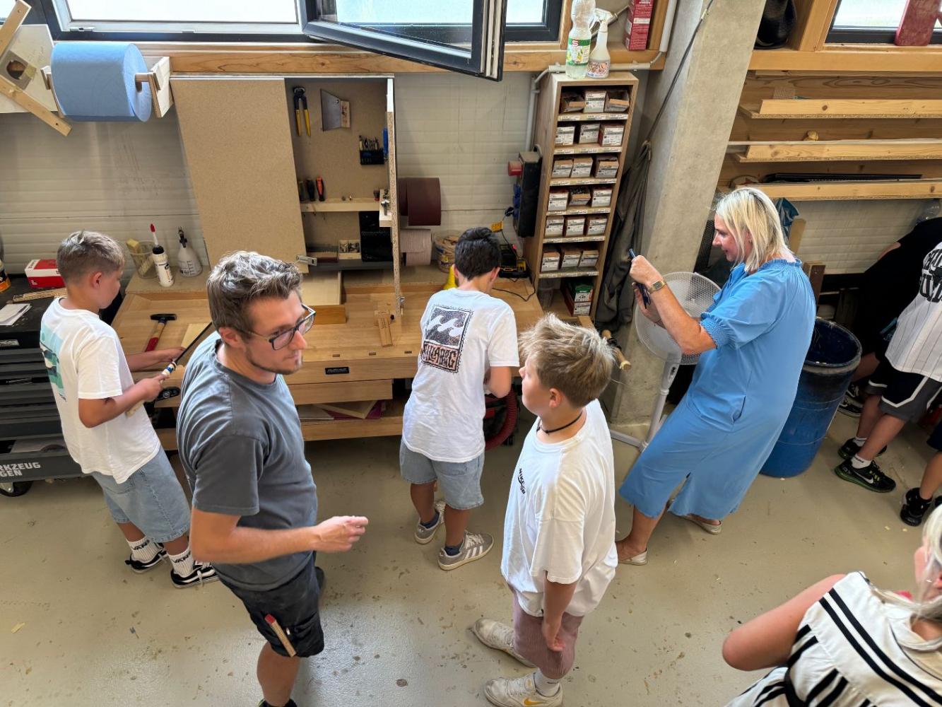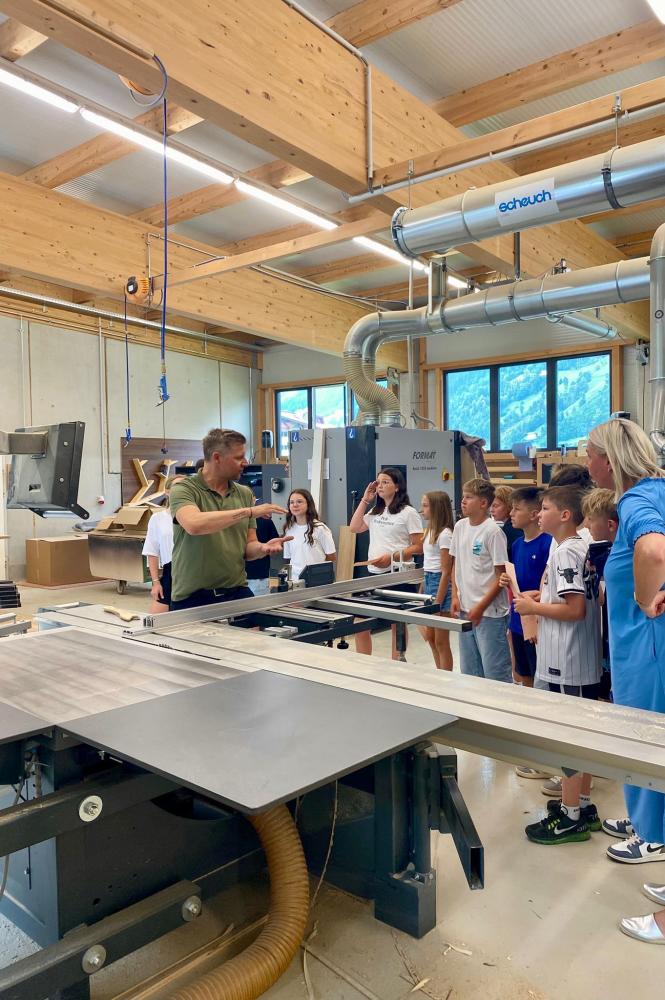 Das Unternehmen beschäftigt 23 Mitarbeiterinnen und Mitarbeiter, darunter vier Lehrlinge, und arbeitet sowohl regional im Zillertal als auch in anderen Teilen Tirols. Das verwendete Holz – meist Eiche – stammt aus regionaler Herkunft, etwa aus Kramsach. Besonders beeindruckt waren die Kinder von der großen Werkstatt mit sechs Räumen und den modernen Maschinen, mit denen millimetergenau gearbeitet wird – gesteuert über den Computer.