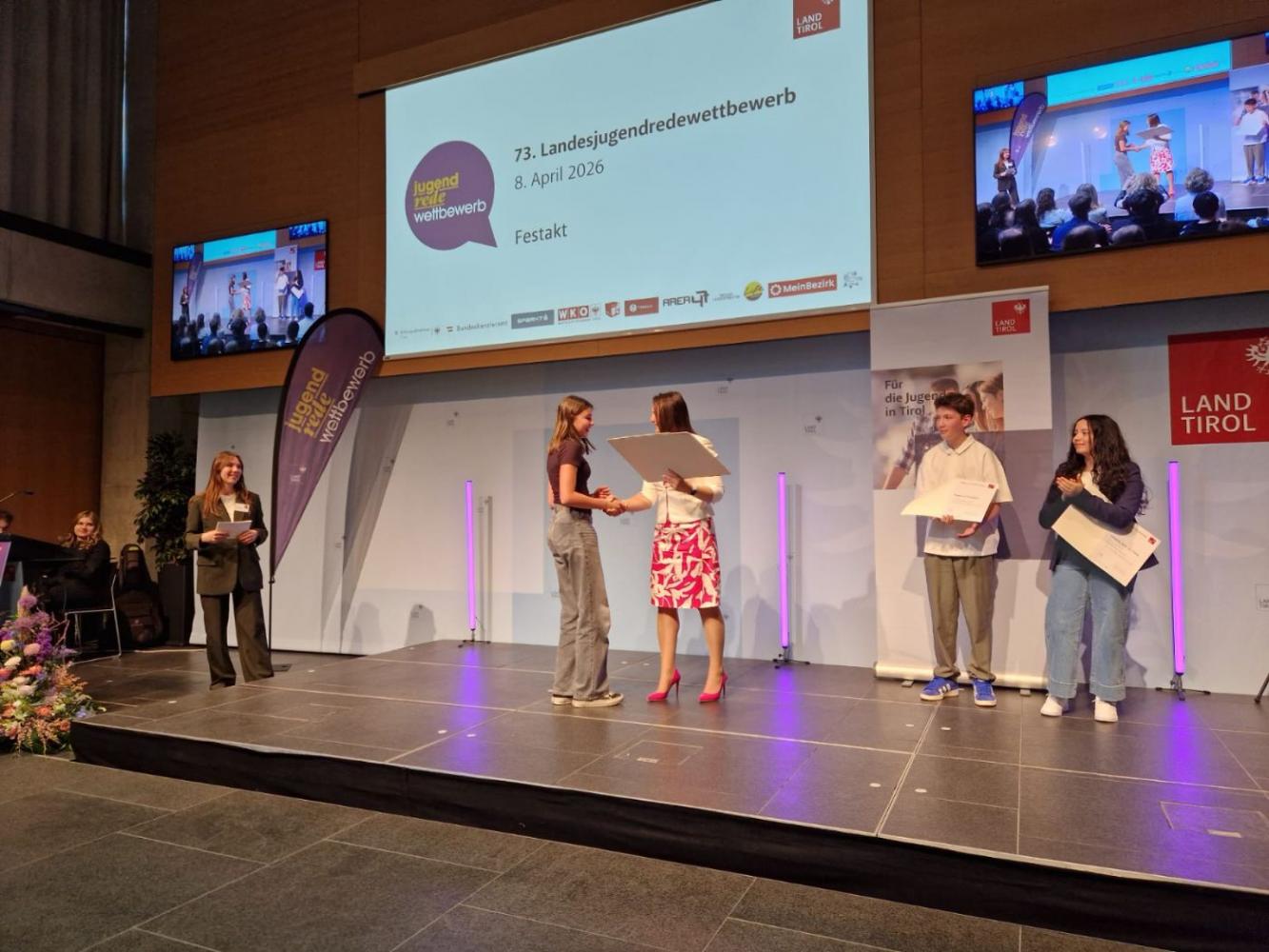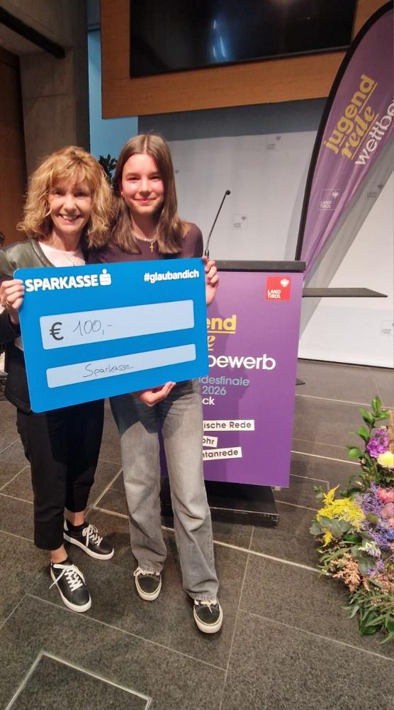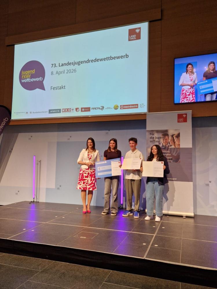 Am Mittwoch, 8. April 2026, fand im Großen Saal des Landhauses in Innsbruck das diesjährige Landesfinale des Jugendredewettbewerbs statt. In der Kategorie „Klassische Rede der 8. Schulstufe“ waren 18 Teilnehmer:innen gemeldet, Carina Arzbacher aus der 4d-Klasse unserer Schule hatte die Startnummer 13. Sie trugt ihre Rede zum Thema „Konsumgesellschaft – Kaufen wir uns glücklich?“ gekonnt vor und überzeugte die Jury nicht nur mit dem Inhalt und dem Aufbau ihrer Rede, sondern mit ihrem sicheren und authentischen Auftreten, der lebendigen Stimmführung und ihrer ausdrucksvollen Sprache.