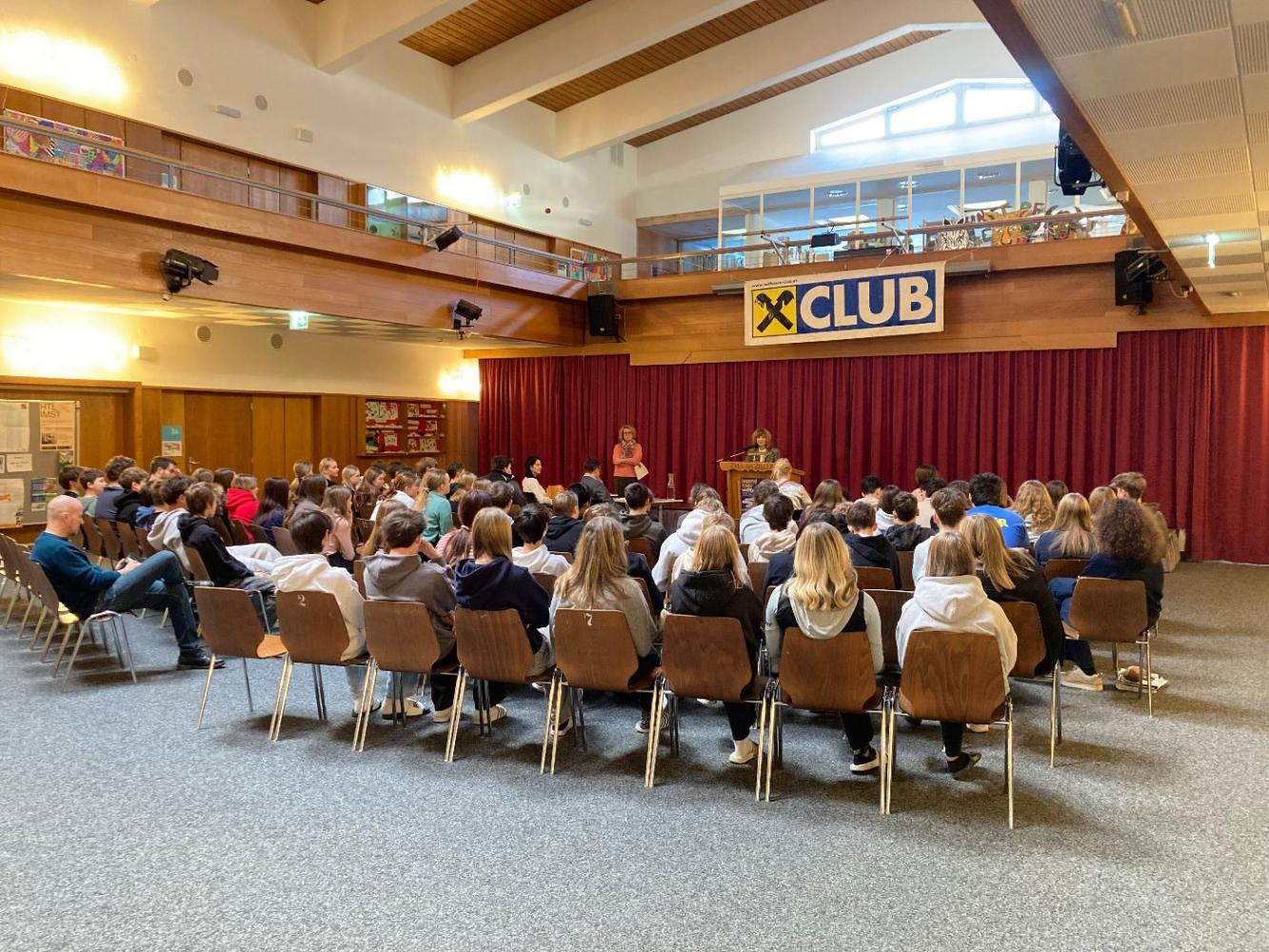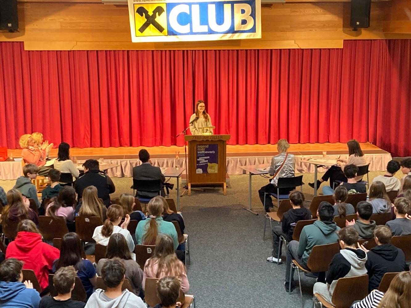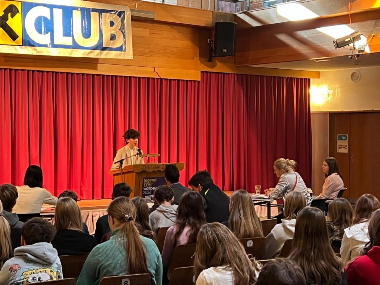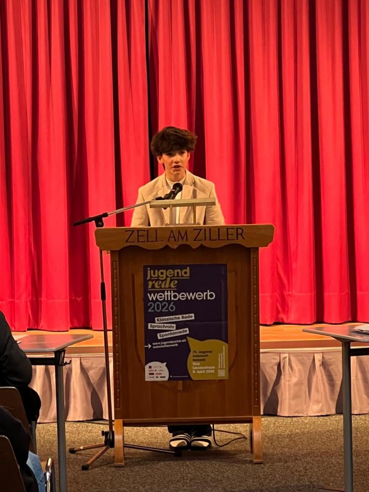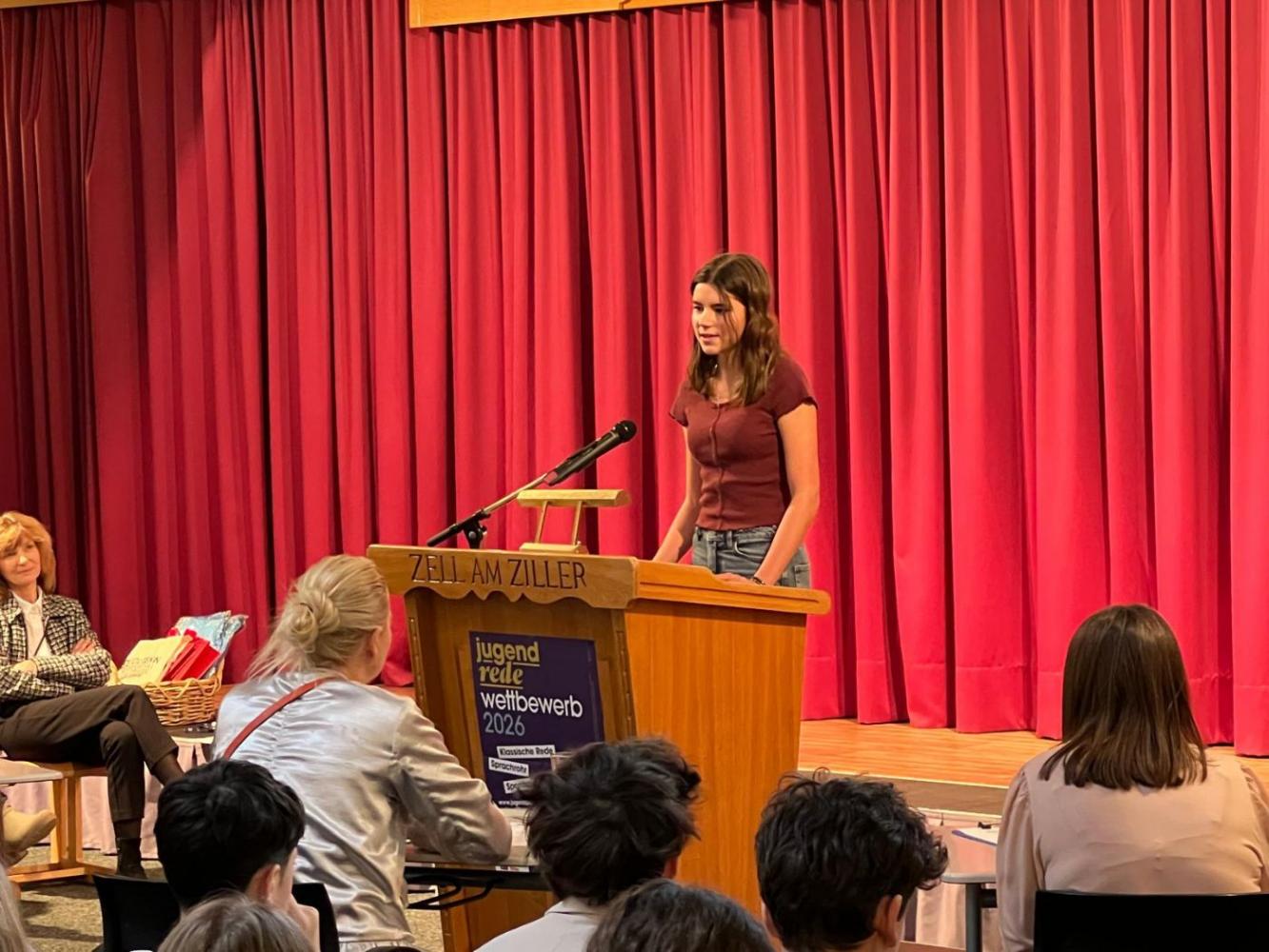 Der Jugendredewettbewerb hat im österreichischen Bildungssystem eine lange Tradition. Er soll redegewandten Jugendlichen die Möglichkeit bieten, zu einem aktuellen und anspruchsvollen Thema Stellung zu beziehen und gleichzeitig die rhetorischen Fähigkeiten unter Beweis zu stellen. Bereits zum 73. Mal wird dieser friedliche Wettstreit mit Worten heuer in allen Bundesländern ausgetragen, und zwar unter dem Motto „talk2us“. Da es aber erstmals keine Bezirksausscheidungen gibt, hat man sich an der Musikmittelschule Zell dazu entschlossen, die Schulausscheidung am 27. Jänner 2026 etwas größer aufzuziehen und eine fachkundige Jury einzuladen, um dem Bewerb an der Schule mehr Gewicht zu verleihen. Die Schüler:innen Kiara Keiler und Joseph Rieser aus der 4a, Thomas Geisler und Matteo Keiler aus der 4b, Josef Stadler aus der 4c und Carina Arzbacher aus der 4d trugen eine „Klassische Rede“ mit 6-8 Minuten Redezeit vor, und zwar zu den Themenkreisen „Social Media“, „Erneuerbare Energien“, „Todesstrafe“, „Crystal Meth“, „KI“ und „Konsum“. Nach dem Vortrag stellten sie sich den Fragen, die von Bernadette Abendstein, der Initiatorin des Theaterfestivals Steudltenn, formuliert wurden. Alle Mitschüler:innen, die anwesenden Lehrpersonen, die Jurymitglieder sowie die beiden Organisatorinnen, Monika Wilhalm und Sabine Geisler, waren tief beeindruckt vom Können und den reifen Aussagen der jungen Redner:innen. Den Sieg trug Joseph Rieser davon, er hatte von der Jury am meisten Punkte erhalten. Das Landesfinale des Jugendredewettbewerbs wird am 8. April 2026 im Landhaus in Innsbruck stattfinden.